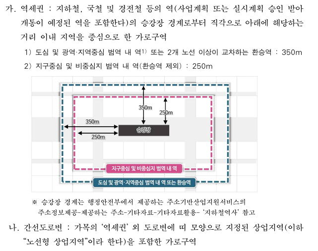 - 1-3-1. 역세권등: 지하철역 승강장 경계로부터 일정 거리(도심/환승역 350m, 일반 250m) 이내 지역 또는 간선도로변 노선형 상업지역을 의미함.